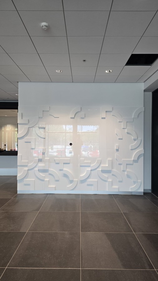 Nasi pracownicy odpowiadali także za realizację elementów wykończeniowych w przestrzeniach biurowych, pomieszczeniach elektrycznych oraz halach. Dodatkowo wykonaliśmy ścianki z firmowym logo oraz ścianę dekoracyjną, która podnosi estetykę poczekalni w lobby. Obie konstrukcje powstały na indywidualne zamówienie i spełniają najwyższe wymagania jakościowe, prezentując eleganckie wykończenie na wysoki połysk.